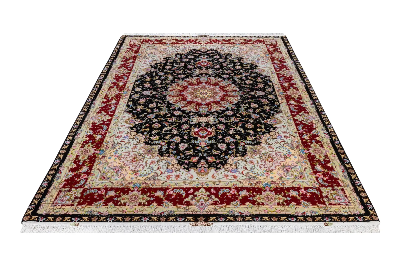 Measuring 3.05 x 2.02 meters (6.16 sqm), its grand medallion blooms over a deep black field, encircled by intricate floral vines in soft ivory and crowned by a regal burgundy border.