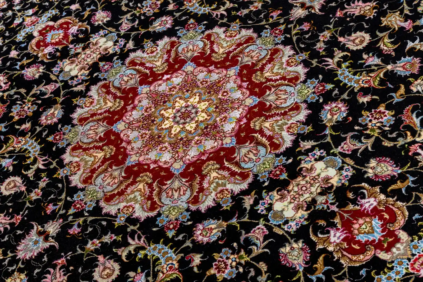 Woven on a luxurious silk warp with a fine wool pile and delicate silk highlights in the floral details, this magnificent carpet glows with rich depth and elegance.