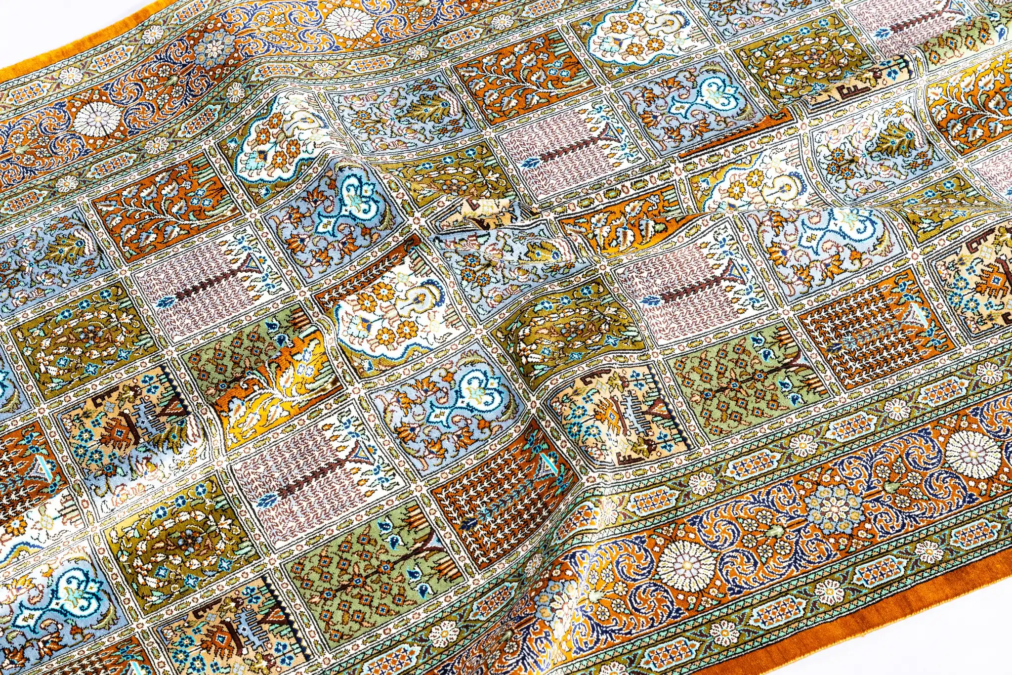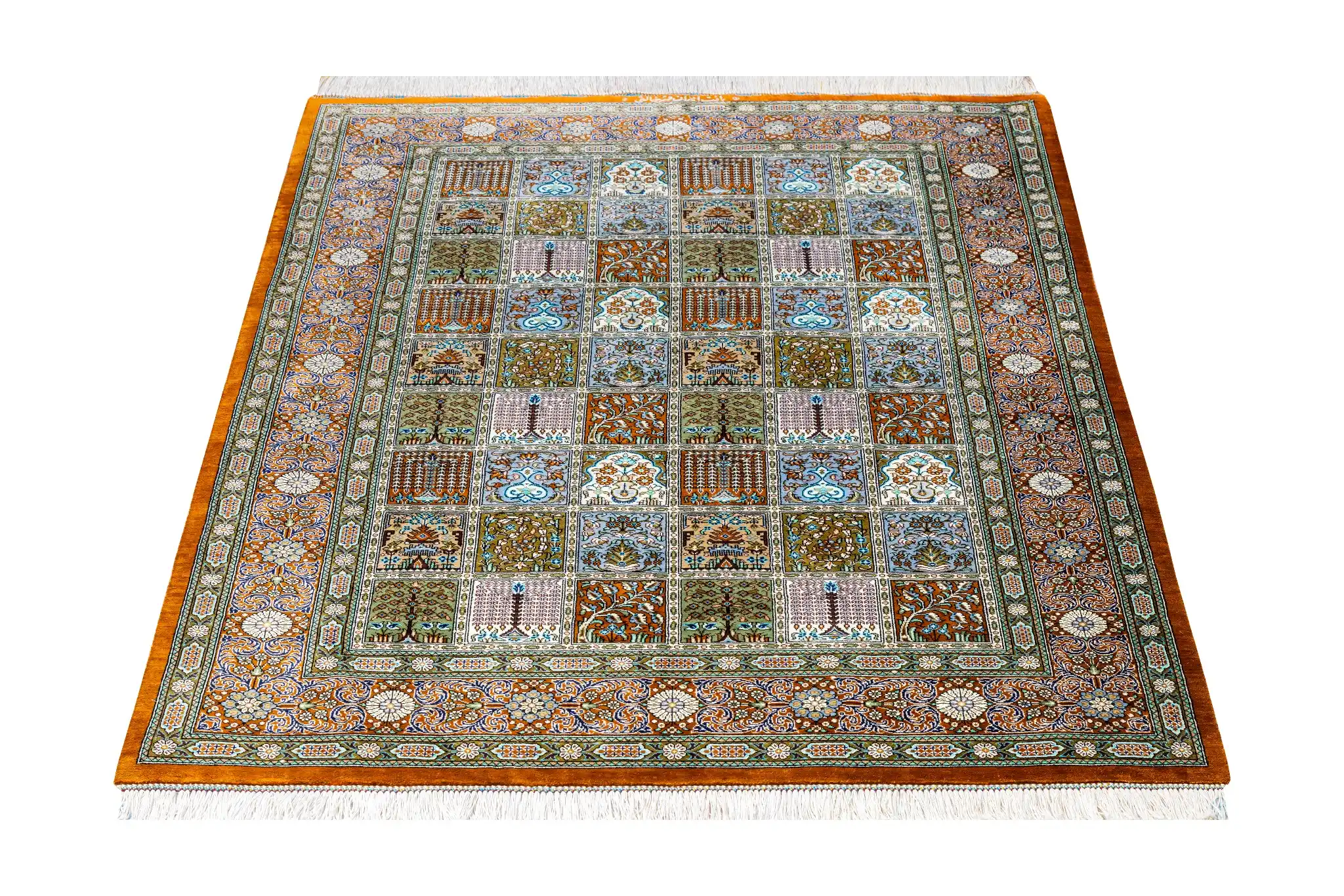 Crafted entirely from 100% natural silk—warp, weft, and pile—this carpet radiates the unmistakable sheen and refined texture unique to pure silk weaving. Its composition follows the timeless Kheshti ( tile) design, where each square represents a miniature artwork, echoing the Persian tradition of garden layouts and architectural mosaics.