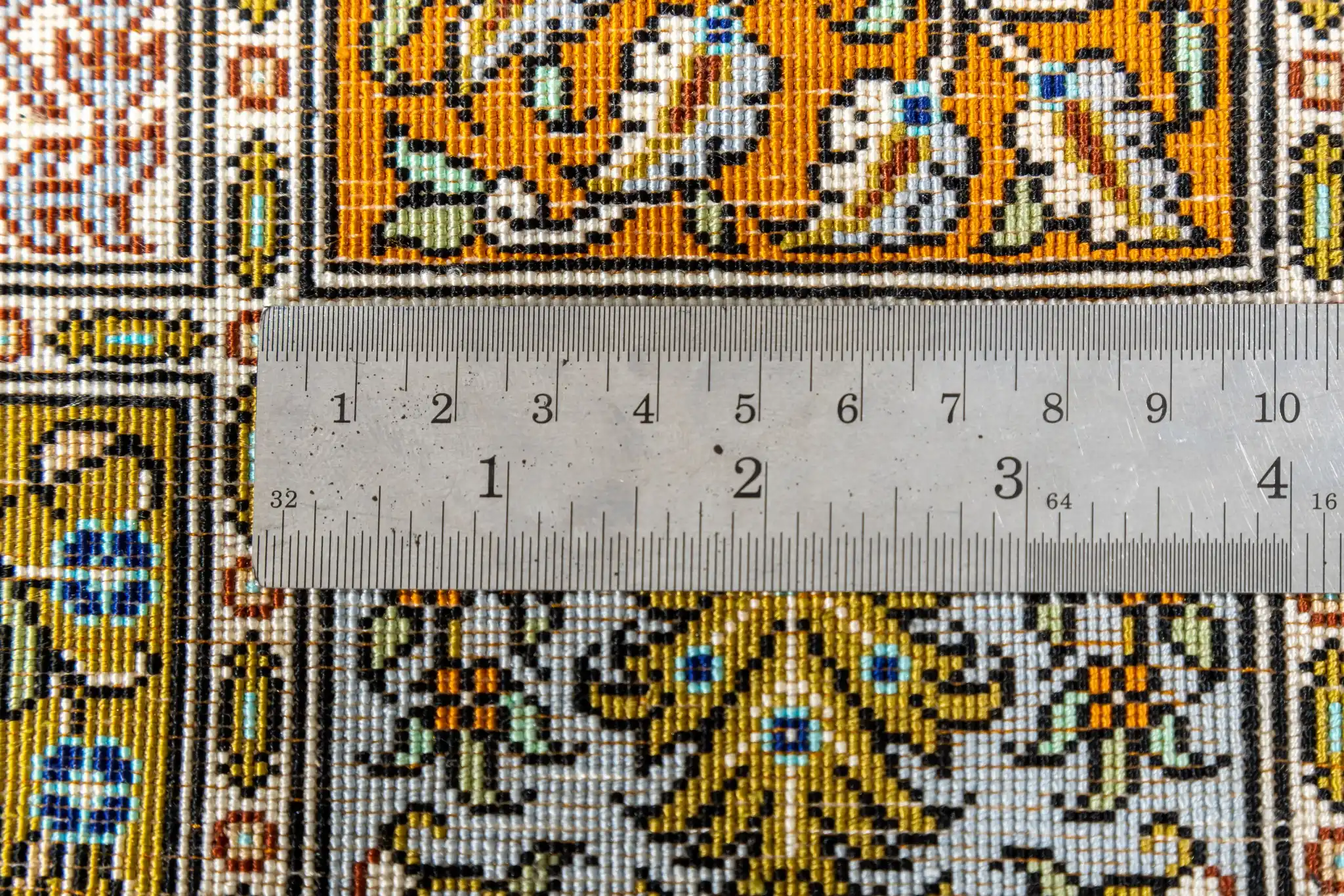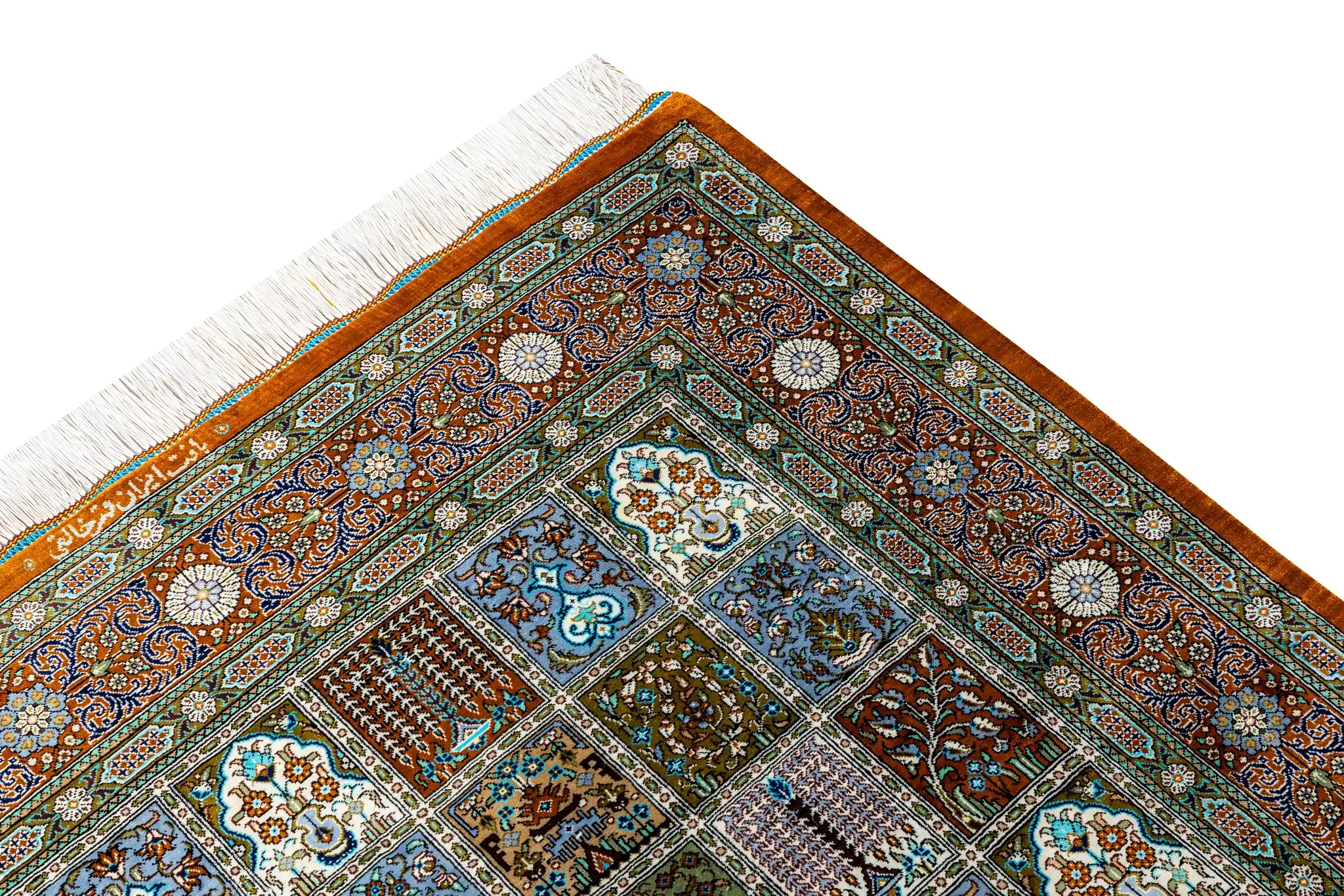 Measuring 1.58 × 1.05 meters (~1.66 sqm), Imperial Mosaic is a striking testament to the artistry of Persian silk weaving. Hand-knotted in the city of Qom, it is woven with an extraordinary 80 Raj density—that’s 80 knots per 7 centimeters—achieving remarkable precision and definition in every motif. Artist name Khaleghi ( خالقی ) signature is woven in the rug.