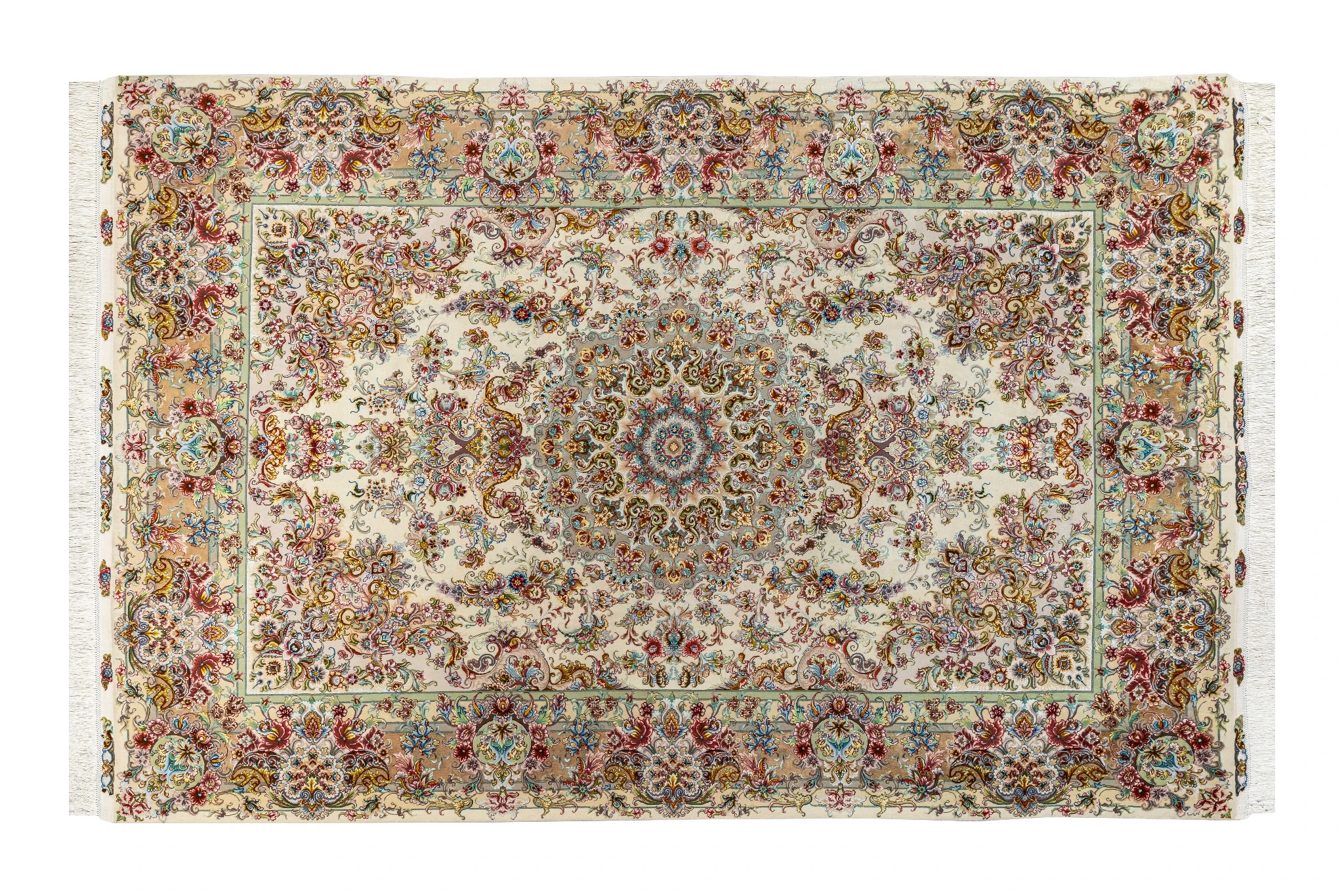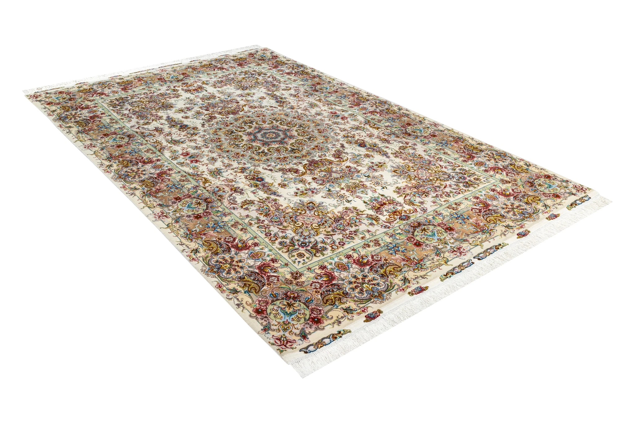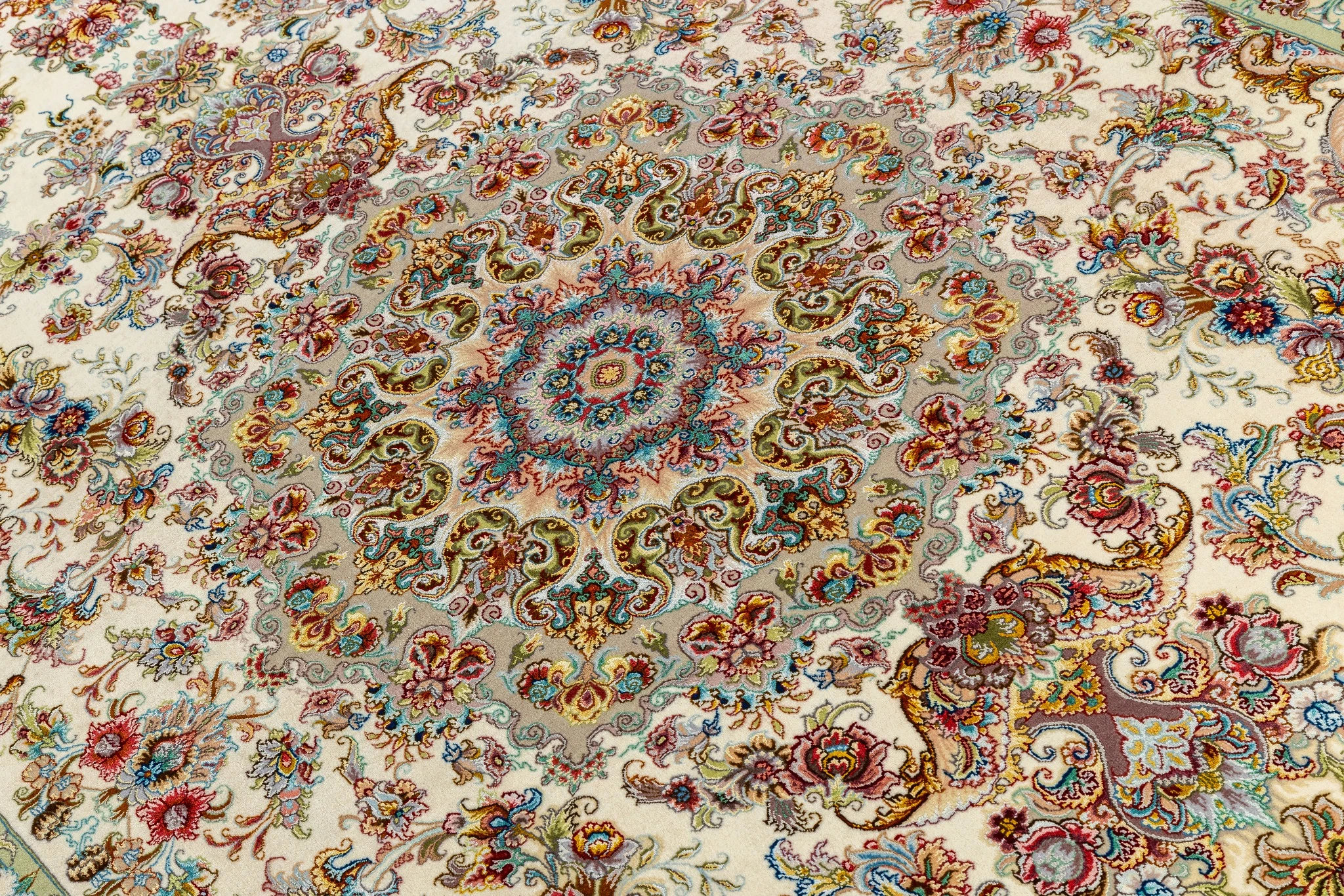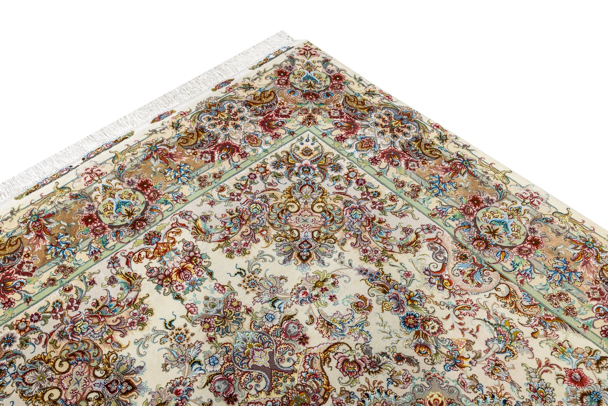 Crafted on luxurious silk warp with high-grade fine wool , with silk used in the basis of frame and in parts of the flowers to give it an extra luxury look, it embodies the height of Persian weaving artistry.