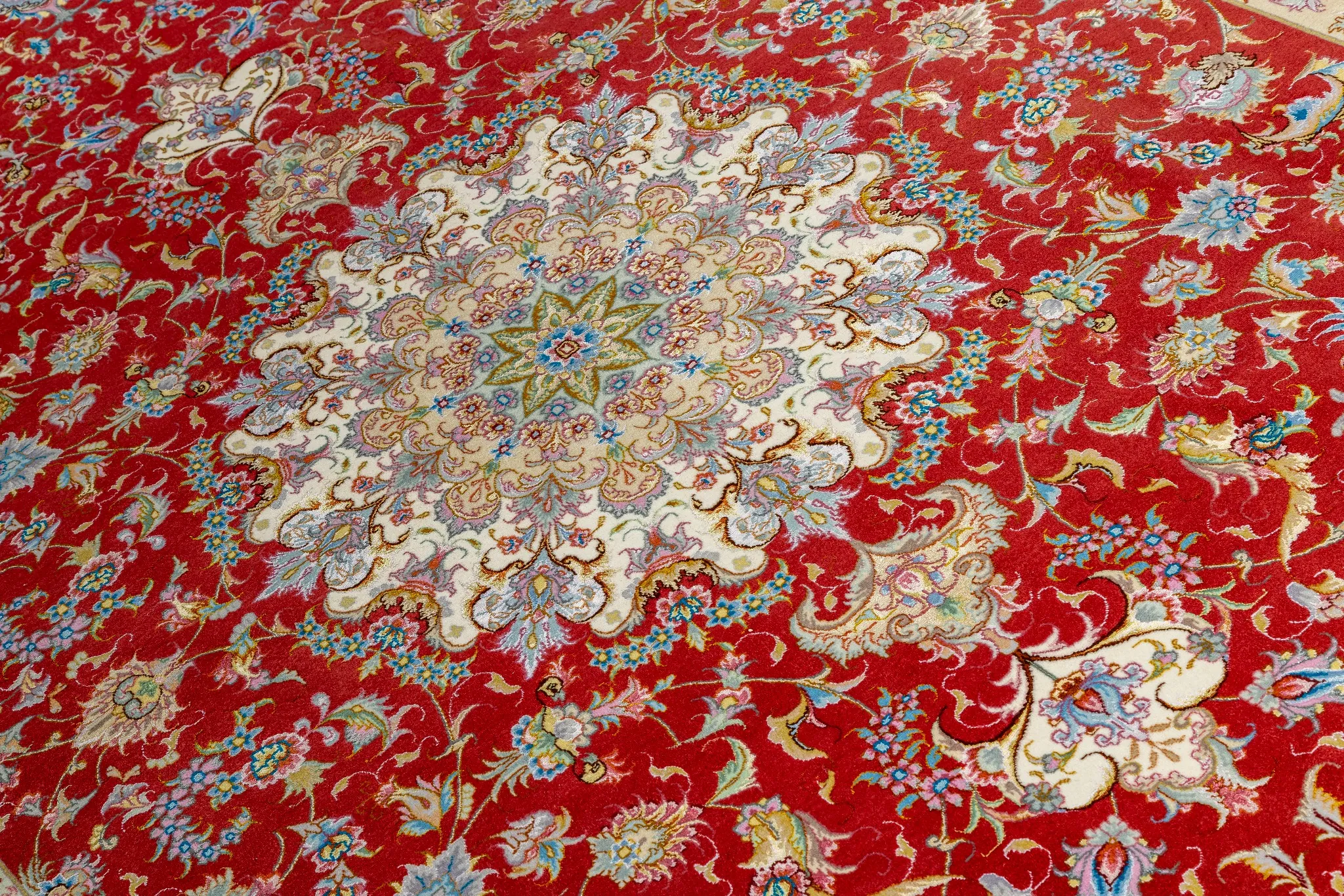 Woven on a luxurious silk warp with a fine wool pile and delicate silk highlights in the floral motifs, this elegant piece shines with a soft, luminous texture.