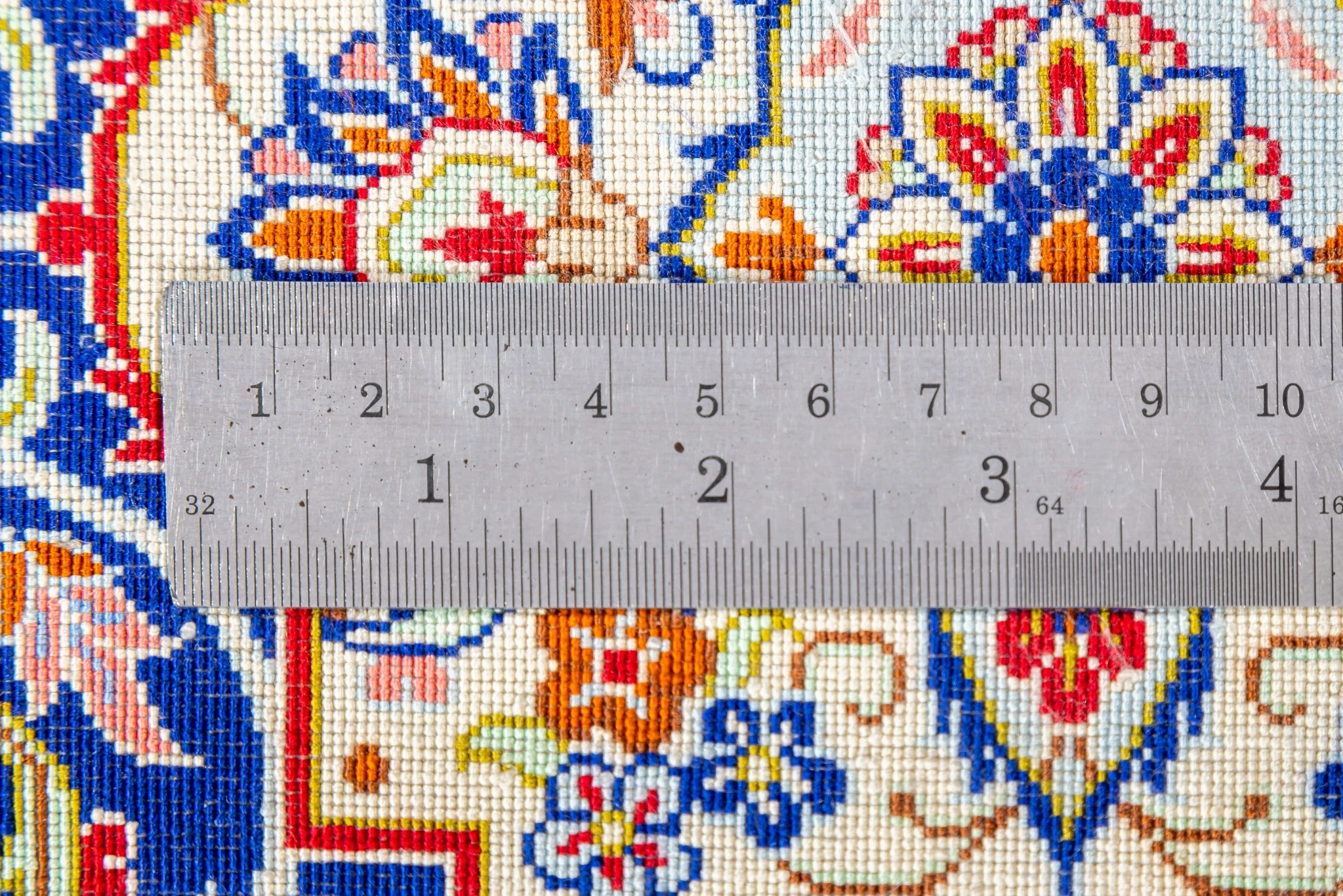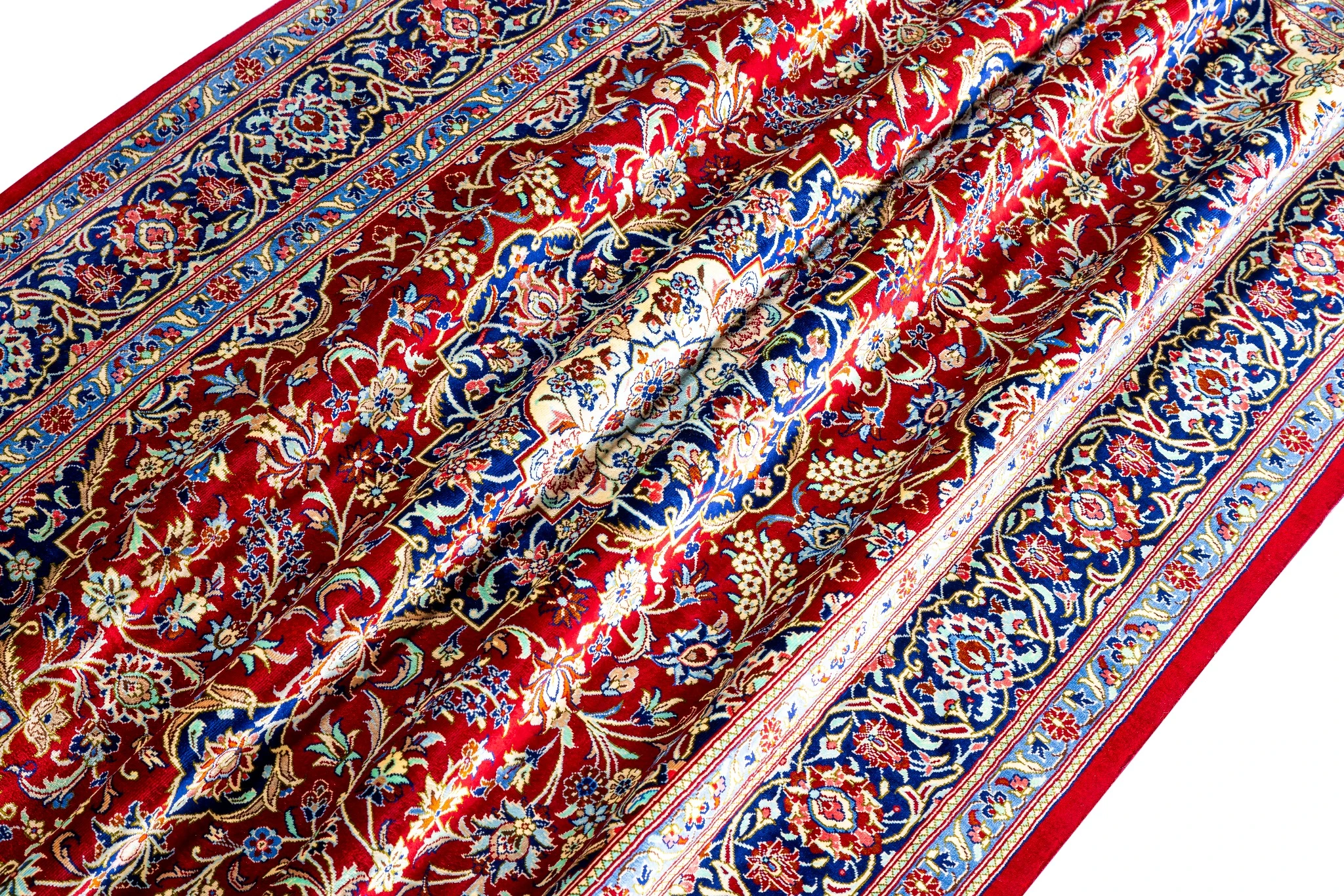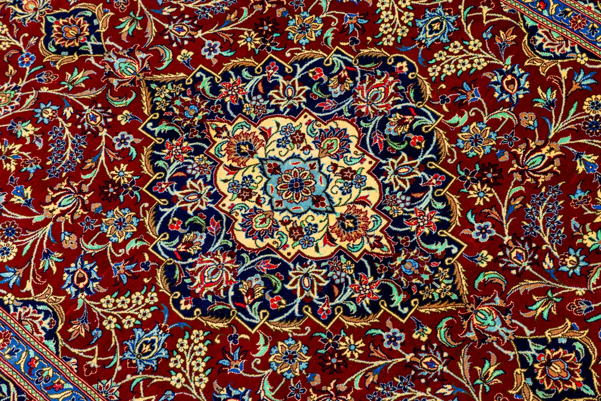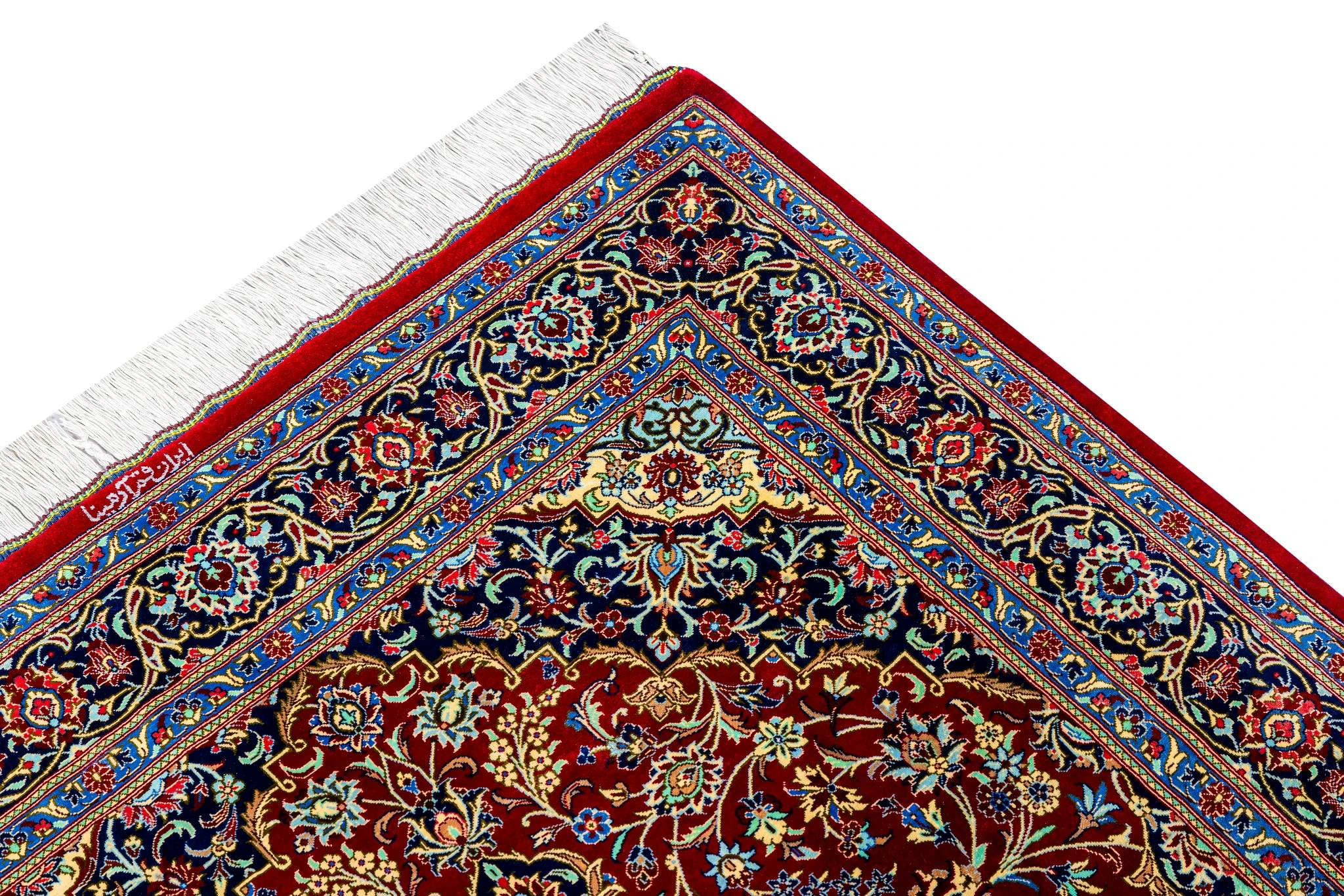 The refined Lachak Toranj (medallion and corner) layout unfolds across a rich ruby red field, adorned with a palette of  sapphire, turquoise, and gold. Each detail is rendered with precision through an 80 Raj (that’s 80 knots per 7 cm) density, allowing for crisp floral motifs and exceptional clarity throughout the design.