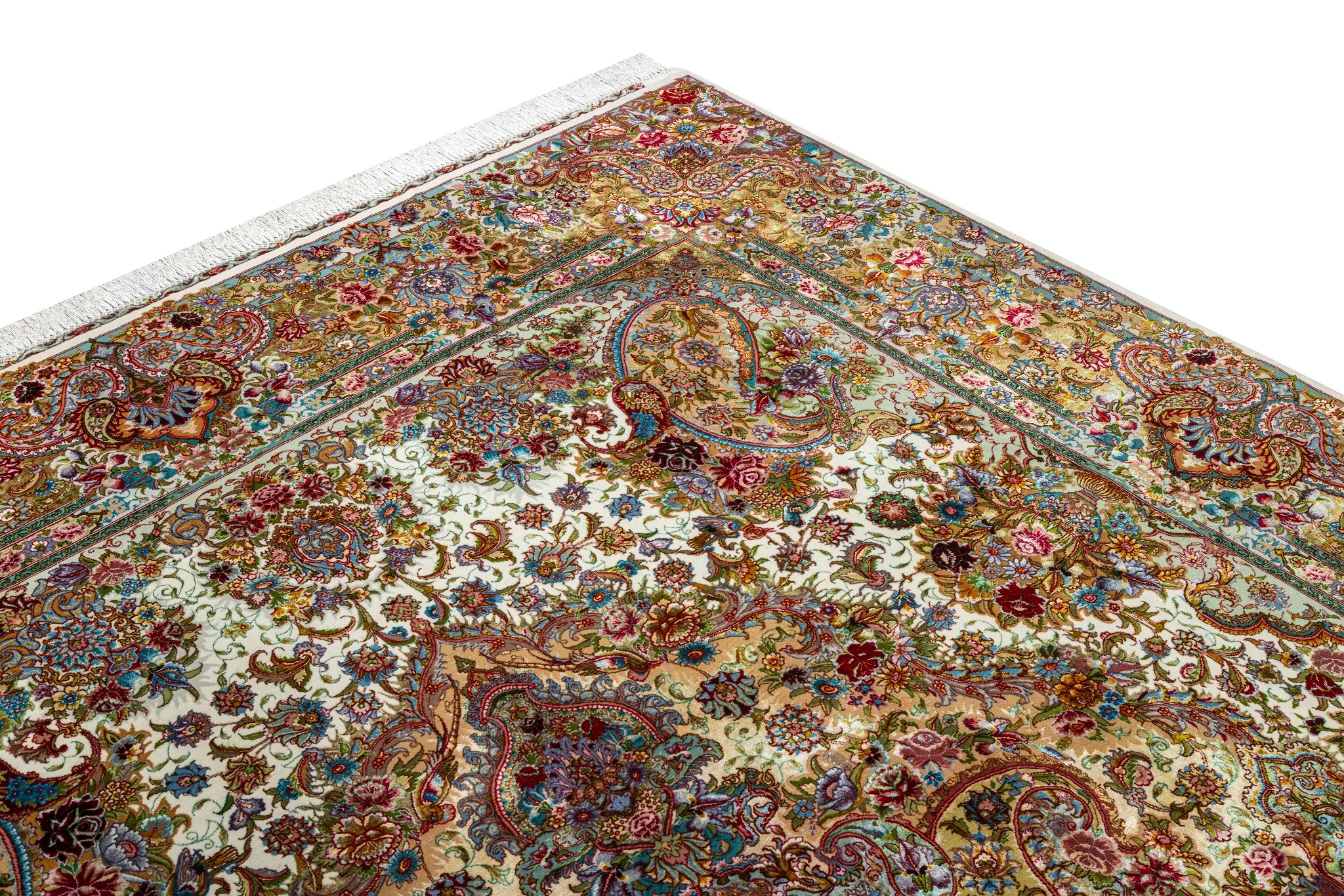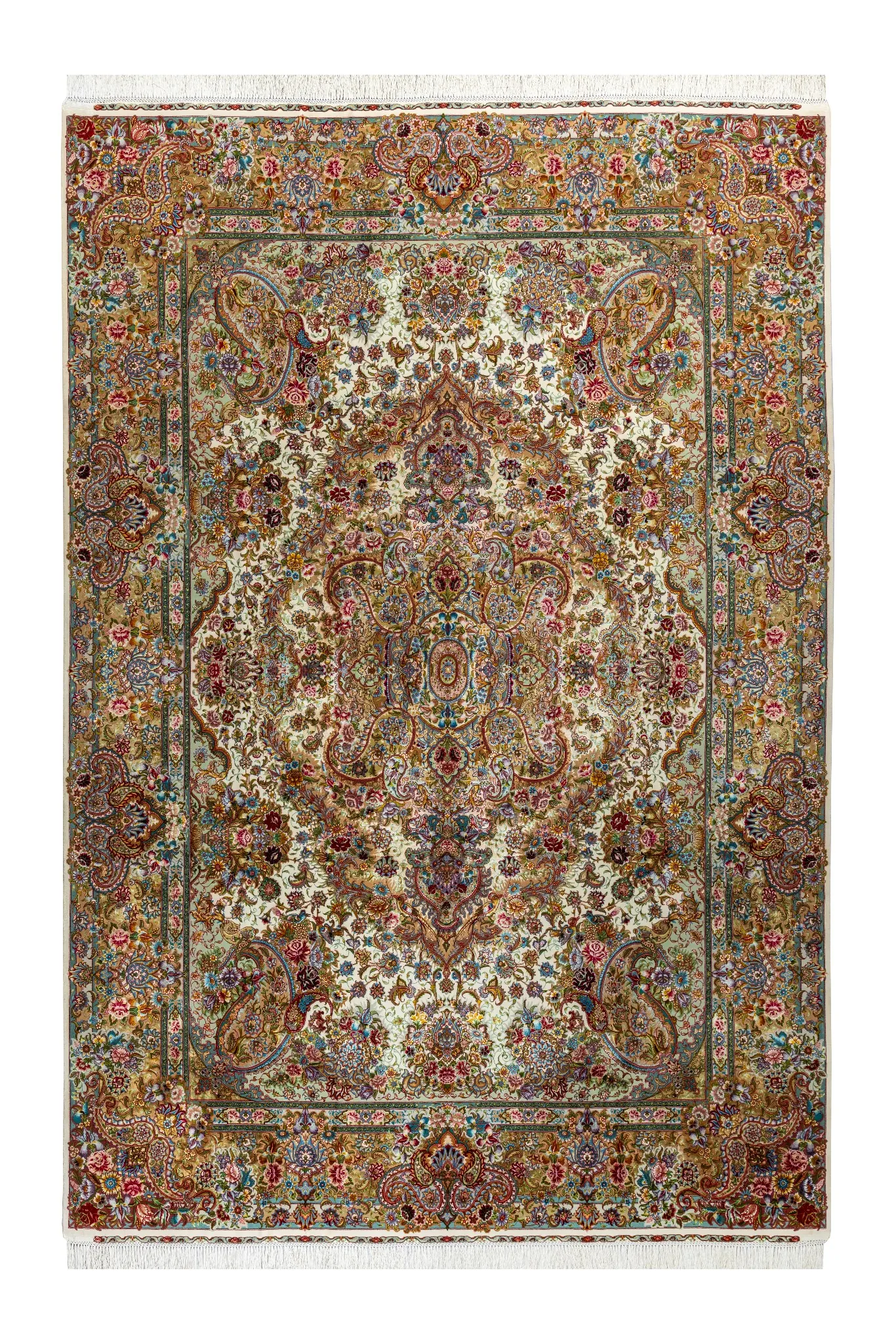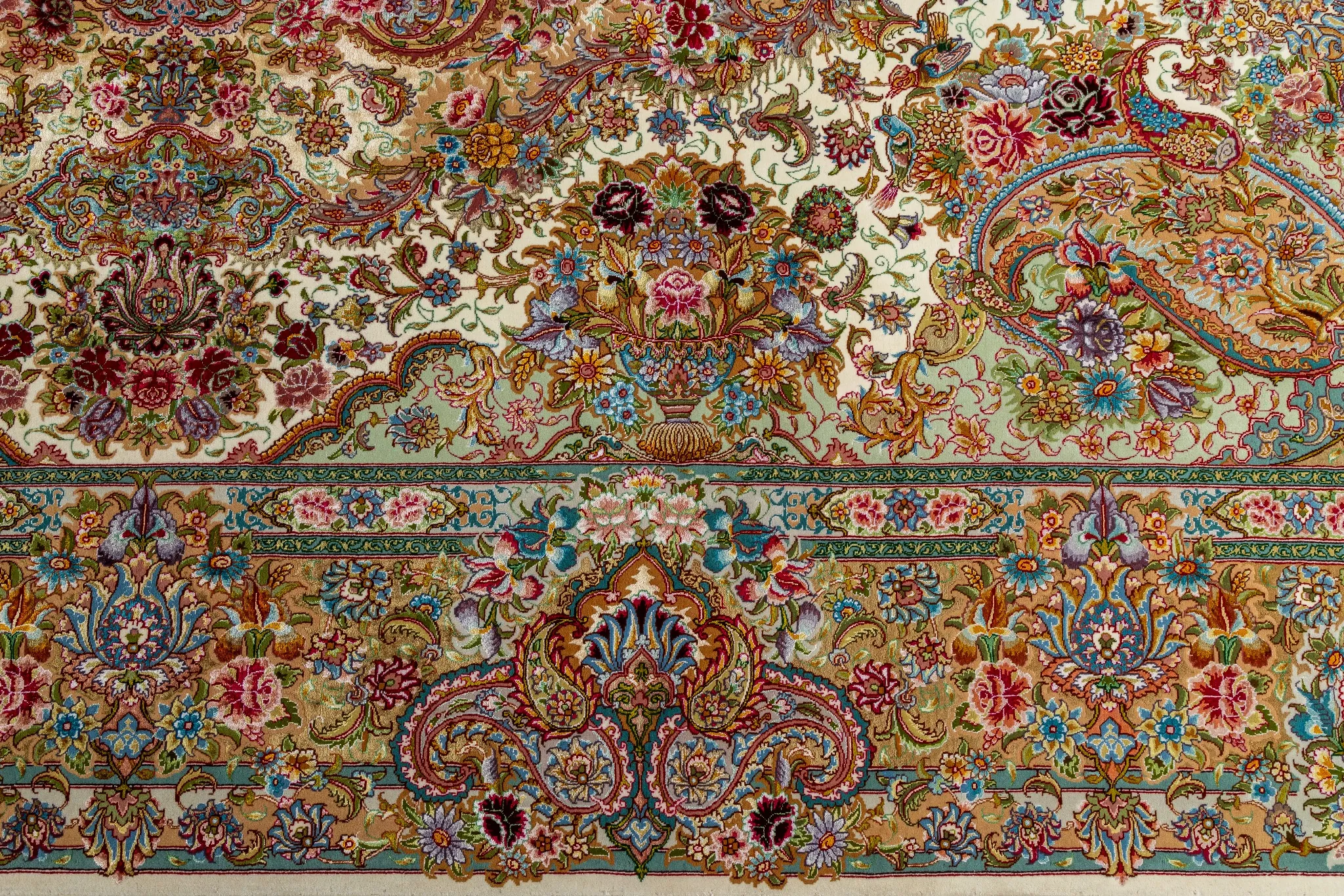 Crafted on luxurious silk warp with high-grade fine wool , with silk in most parts of the pattern and flowers to give it an extraordinary elegant look, it embodies the height of Persian weaving artistry.